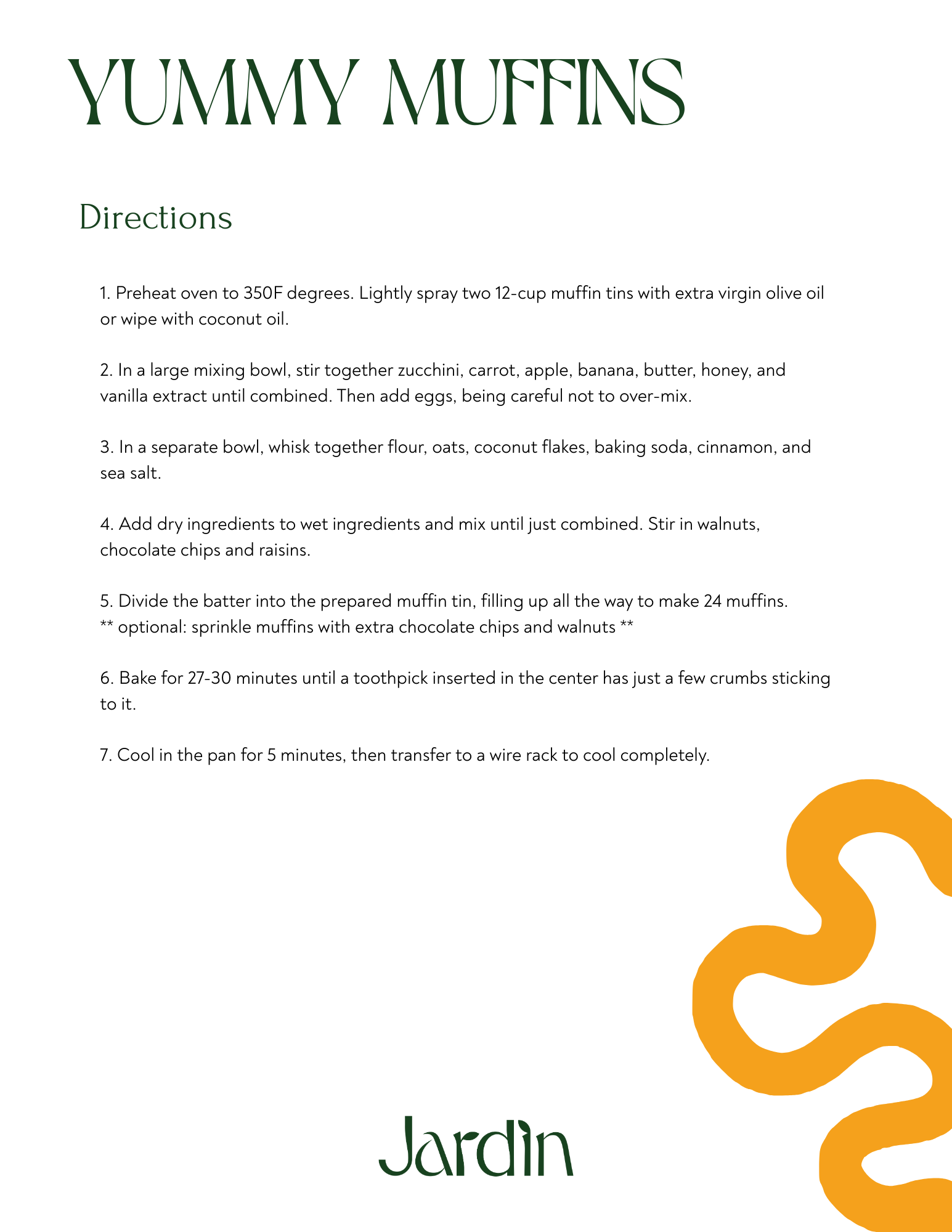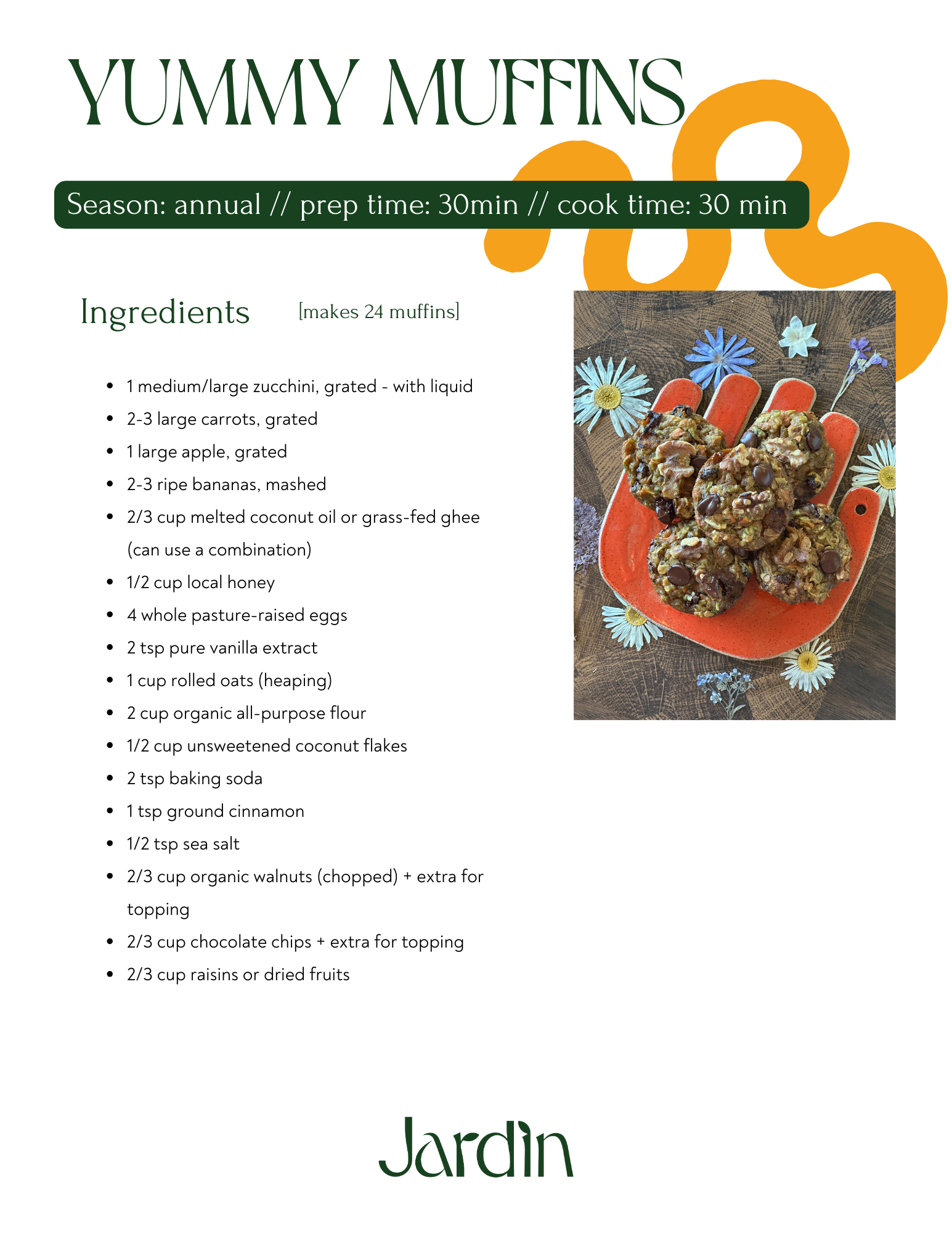 Grandma Margaret is always prepared for visitors with these freezer-friendly yummy muffins. These hearty treats are packed with the goodness of the garden: zucchini, banana, carrots, and apples bring natural sweetness and moisture, while oats, nuts, and raisins add heartiness and texture. A handful of dark chocolate chips add an antioxidant-rich touch of indulgence.